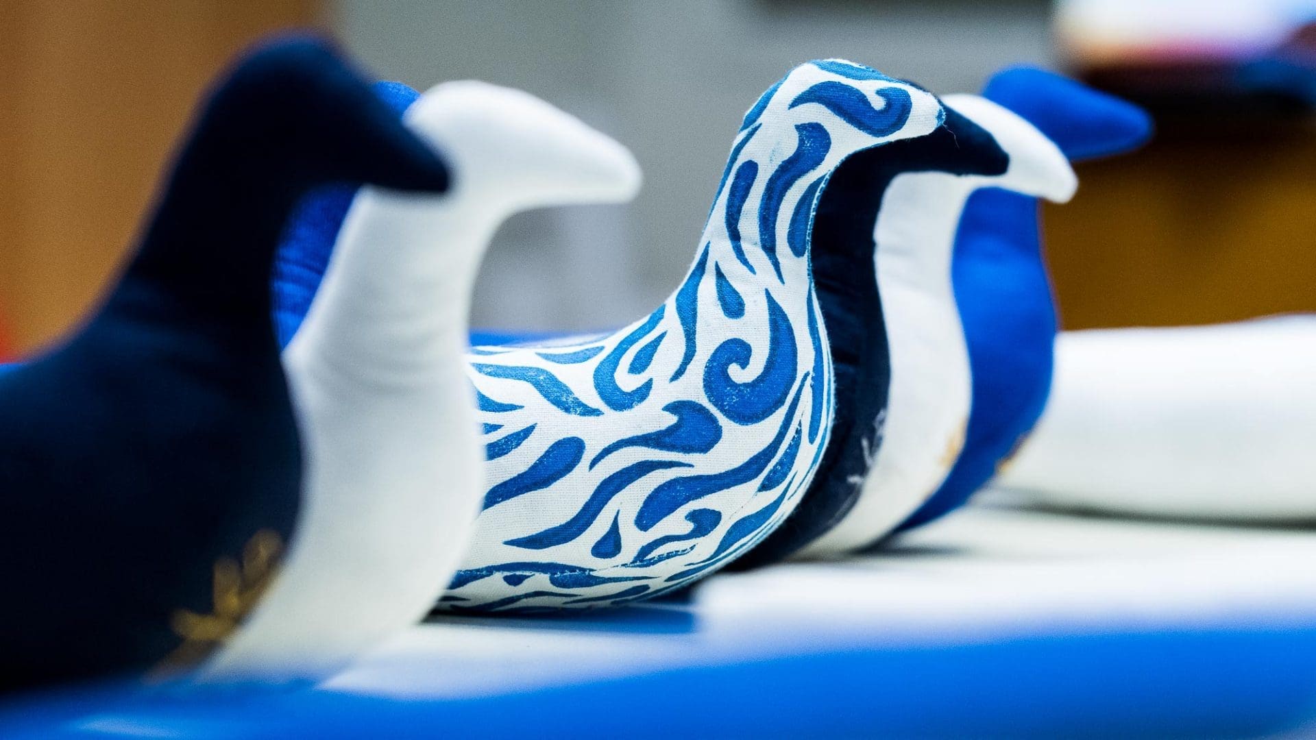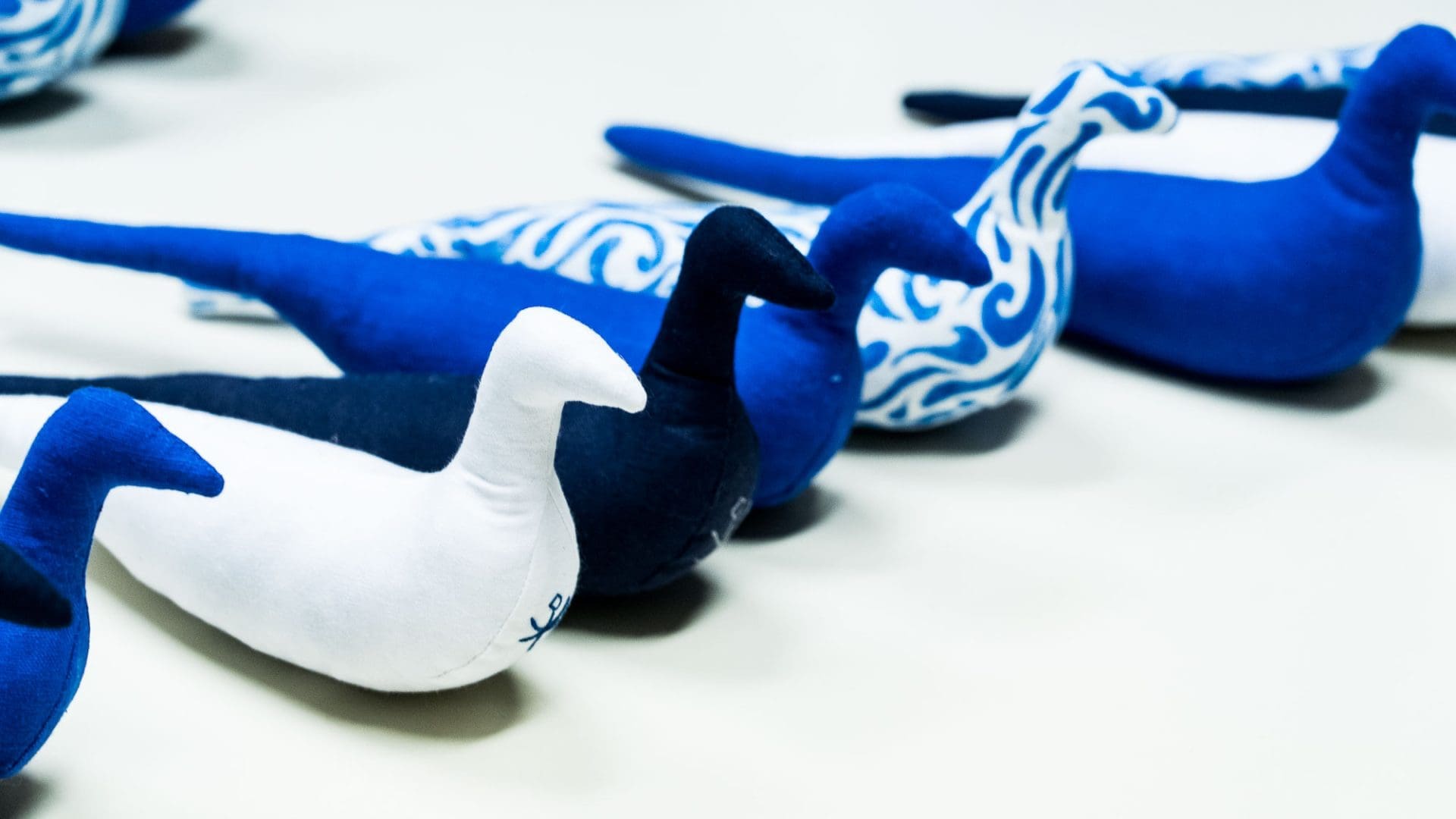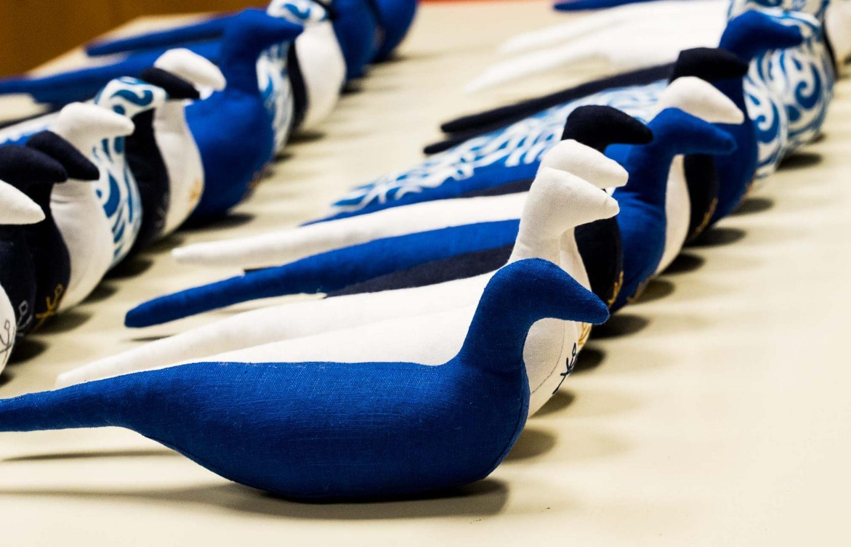 Χειροποίητο υφασμάτινο πτηνό με διακριτικό άρωμα λεβάντας και εσωτερικό πουγκί με άμμο για σταθερότητα. Coca Handmade — Κωνσταντίνα Ευθυμιάδου. Λευκό, Μπλε navy, Μπλε κοβαλτίου & Λινoπρίντ. Made in Greece.