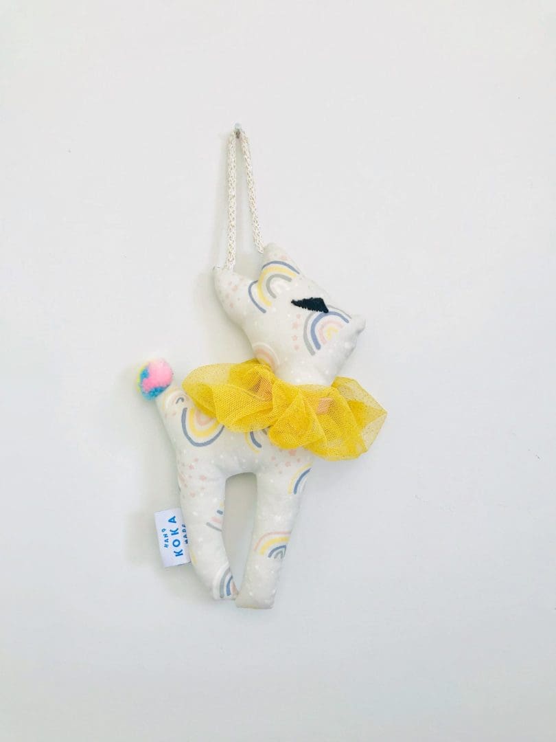 • Υλικά: βαμβακερό ύφασμα, μεταλλικό κουδουνάκι στο εσωτερικό, πολύχρωμο Pom-Pon, αξεσουάρ για τα μαλλιά/scrunchie από τούλι, στοιχεία κεντημένα στο χέρι, υποαλλεργική γέμιση